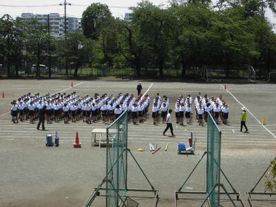 一年生が初めての体育祭に向けて、学年練習をしました。はじめは学年全体で整列し、「台風の目」「全員リレー」の練習でした。