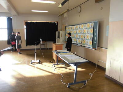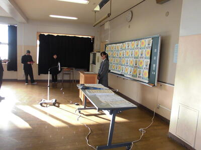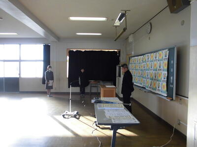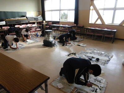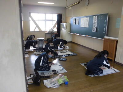現在、国語科では、毛筆の授業を行っております。場所は、普通教室ではなく、多目的室と研修室を使用して、床の上に直接準備をして書いています。今年度の書初め展の文字を集中して書いています。