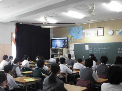 始業式です。今日も体育館の工事の関係でオンライン配信です。始業式後に表彰される生徒たちは、オンラインの配信会場で着席して始業式を受けています。