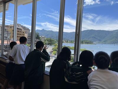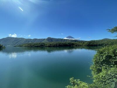ホテルを出発すると外は快晴、西湖の奥に富士山が輝いています🗻