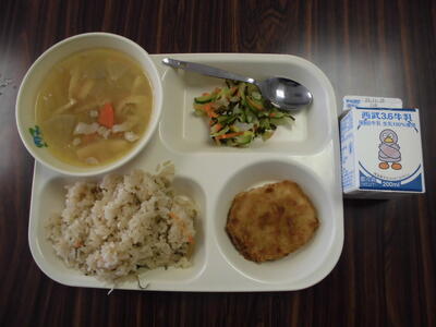 〈かて飯、さつま汁、小松菜メンチカツ、白菜のゆず漬物、牛乳〉