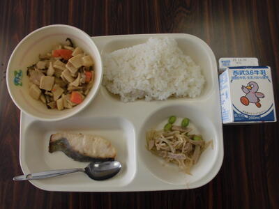 〈ご飯、高野豆腐のうま煮、鰆の西京焼き、もやしとハムのピリ辛和え、牛乳〉