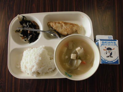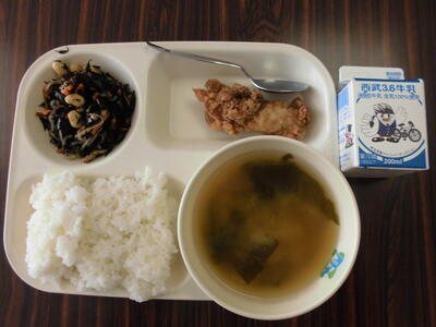 〈ご飯、玉ねぎの味噌汁、鶏肉の唐揚げ、ひじきと大豆の炒め煮、牛乳〉