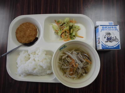 〈ご飯、沢煮椀、里芋コロッケ、キャベツの塩昆布和え、牛乳〉