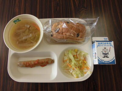〈ぶどうパン、ABCスープ、焼きウインナーのチリソース、コールスローサラダ、牛乳〉