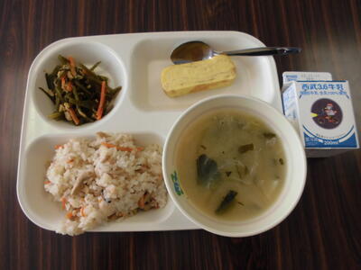 〈子ぎつねご飯、じゃが芋の味噌汁、厚焼き玉子、茎わかめとツナの炒め煮、牛乳〉