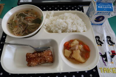<沢煮椀、イカの竜田揚げ、じゃが芋と鶏肉の煮物、ご飯、牛乳>