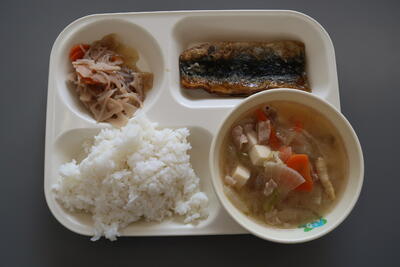 <豚汁、秋刀魚の蒲焼き、れんこんきんぴら、ご飯、牛乳>