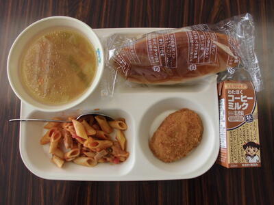 〈チーズパン、野菜スープ、エビカツ、ペンネのトマト煮、コーヒーミルク〉